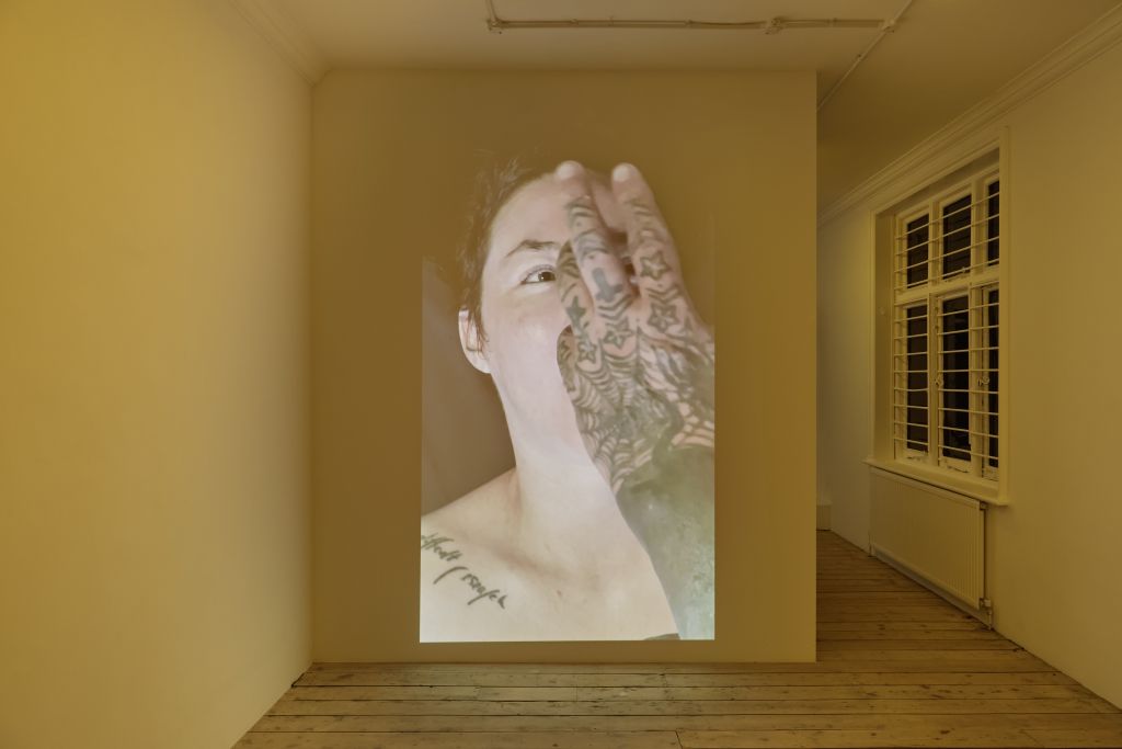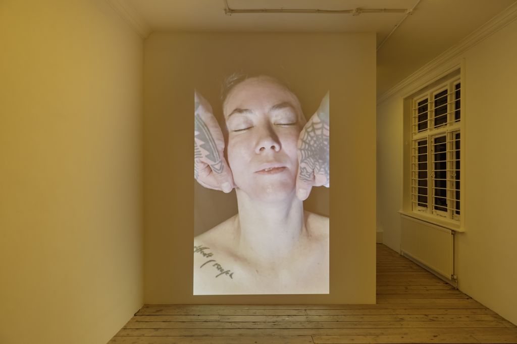 The single-channel video is a vertical shot of the artist receiving a facial massage from Ron Athey. Only the hands, heavily tattooed, of Athey are visible around, and in, Hedva’s face. Athey pushes his hands deep into Hedva’s mouth and nose, and wraps them around the skull. Hedva winces in pain and also smiles.