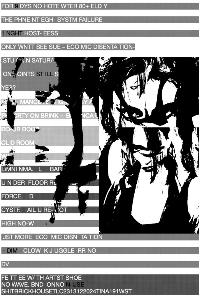 TINA presents a collective work by TLC23 titled SHITBRICKHOUSETLC2313122024TINA191WST from 6pm until late, that sees the occupation and transformation of the space as a situational and durational work. The project thinks about support systems in times of precarity and instability, offering a reactionary procedure, activating the gallery space through live musical acts within a constant and conflicting frequency or ‘shattered undercurrent’. DJ mix, live spoken text, processed, percussive interventions and an, as ever, industrial temporal backdrop (steel installation and accessories) are understood not as a protest but just the continuous drudge of the melancholy role-play we are subjected to. SHITBRICKHOUSETLC2313122024TINA191WST offers a cognitive break from this, and collectively, together, at least temporarily, this can feel exultant. A bar will be set up in TINA for the duration of the evening and an editioned poster will be available on the night. An additional text will be included, and elements of the project will appear on TLC23’s archived NTS radio show with Katie Shannon.
